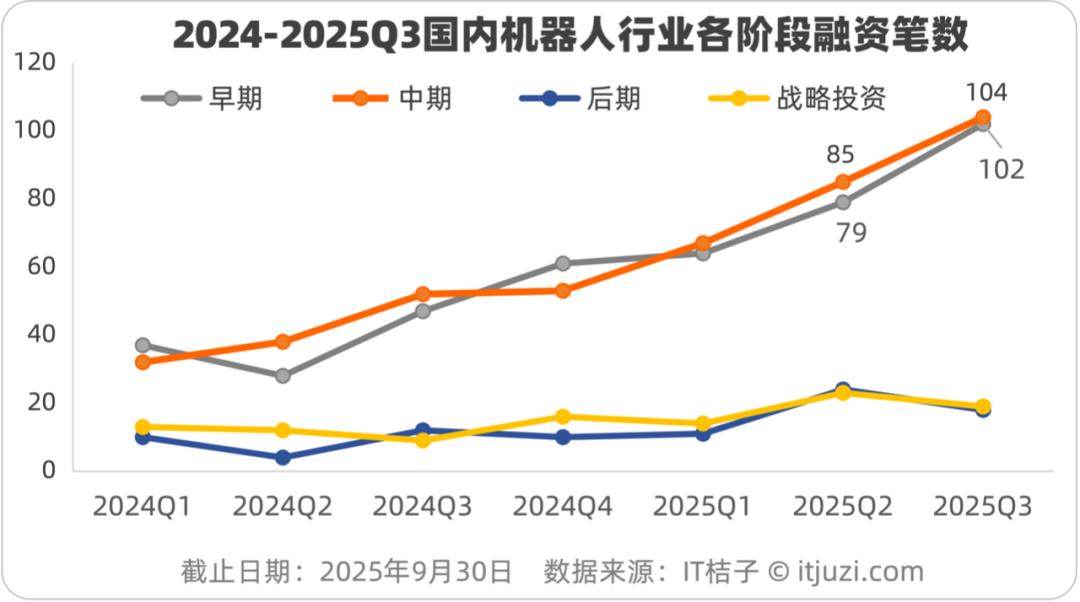据IT桔子统计,2025年前三季度,国内机器人行业新增一级市场融资事件达到了610笔,较去年同期的294笔实现了同比翻倍增长。尤其是进入下半年以来,机器人赛道融资事件更是呈现加速增长的态势,Q3有243笔投资事件,同比增102%。