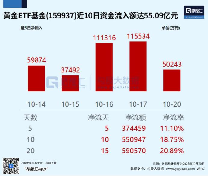 其中,黄金ETF基金(159937)连续获得资金流入,近10日流入额达55.09亿元,年内资金净流入额132.51亿元,最新规模392.57亿元,位居同类前列。