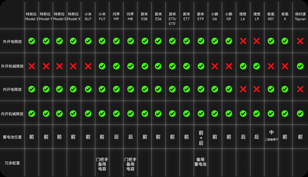 很多新能源车企已经提前意识到了问题,比如小米YU7、问界M8都在电解锁门把手的基础上,配备了机械解锁回路,提前符合了国标要求。甚至还配备了CPM备用电容,可以在蓄电池断电的情况下,为门把手提供额外的48小时供电。此外像蔚来ET9,它在前舱蓄电池的基础上,还在后备箱设置了备份电池。这些努力,就是为了让极端场景下的安全,也能得到保障。