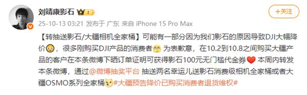 它的竞争对手——影石创新(Insta360)的90后创始人刘靖康,在微博上演了一出“凡尔赛式道歉”。他半开玩笑地表示,“可能有一部分因为我们影石的原因导致大疆降价”,并“诚恳”地为购买了大疆产品的用户提供100元自家无门槛代金券,还抽奖送“全家桶”。