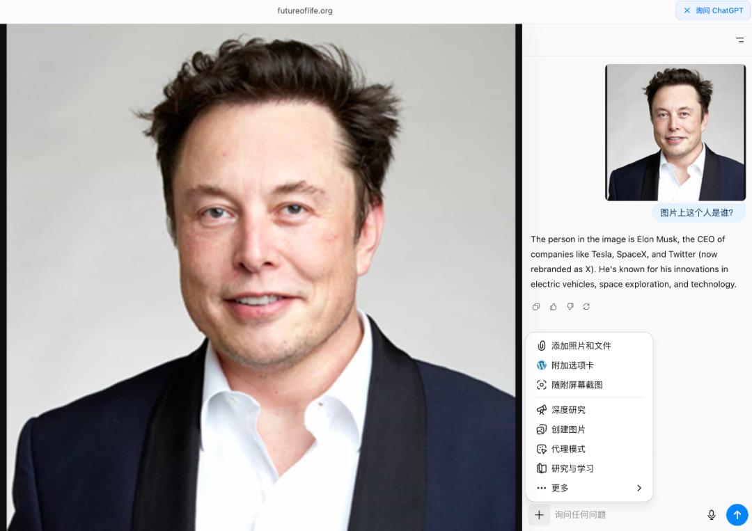 另外,Atlas 还支持截图,点右侧的 + 号,选「随附屏幕截图」就能上传,我找了张马斯克的照片,照着这么操作一遍,它也能准确认出是马斯克。