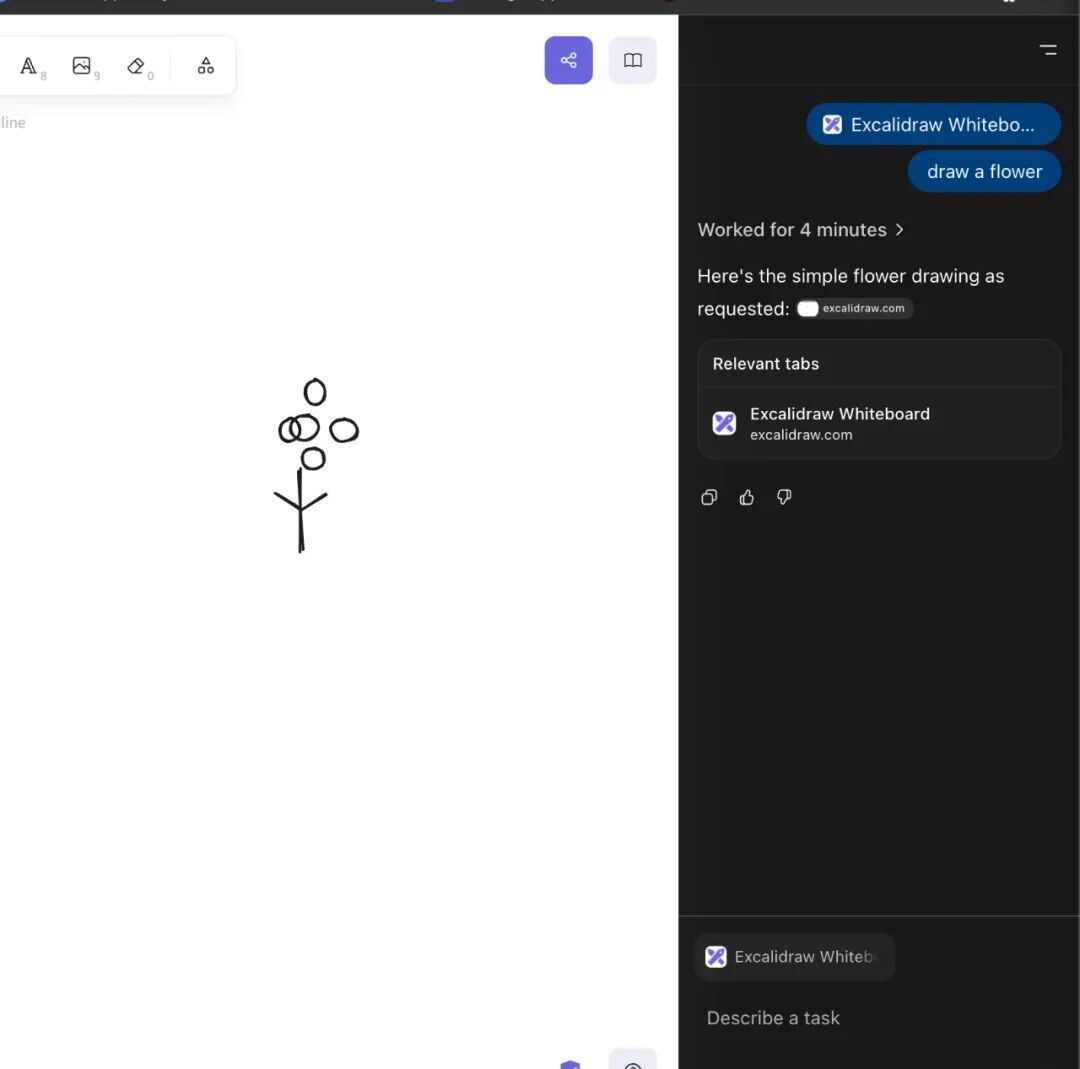 搭配侧边栏的 Agent 模式,玩法也能很有趣。网友 @mteamisloading 让 Agent 在绘画网站里画了朵花,全程只花了 4 分钟。