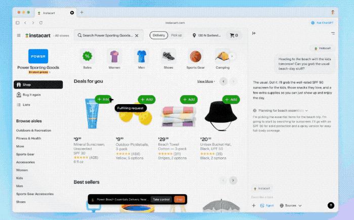 如用户计划晚宴时将食谱交给ChatGPT,它就可以它找到一家杂货店,将所有食材添加到购物车中,然后订购到家。