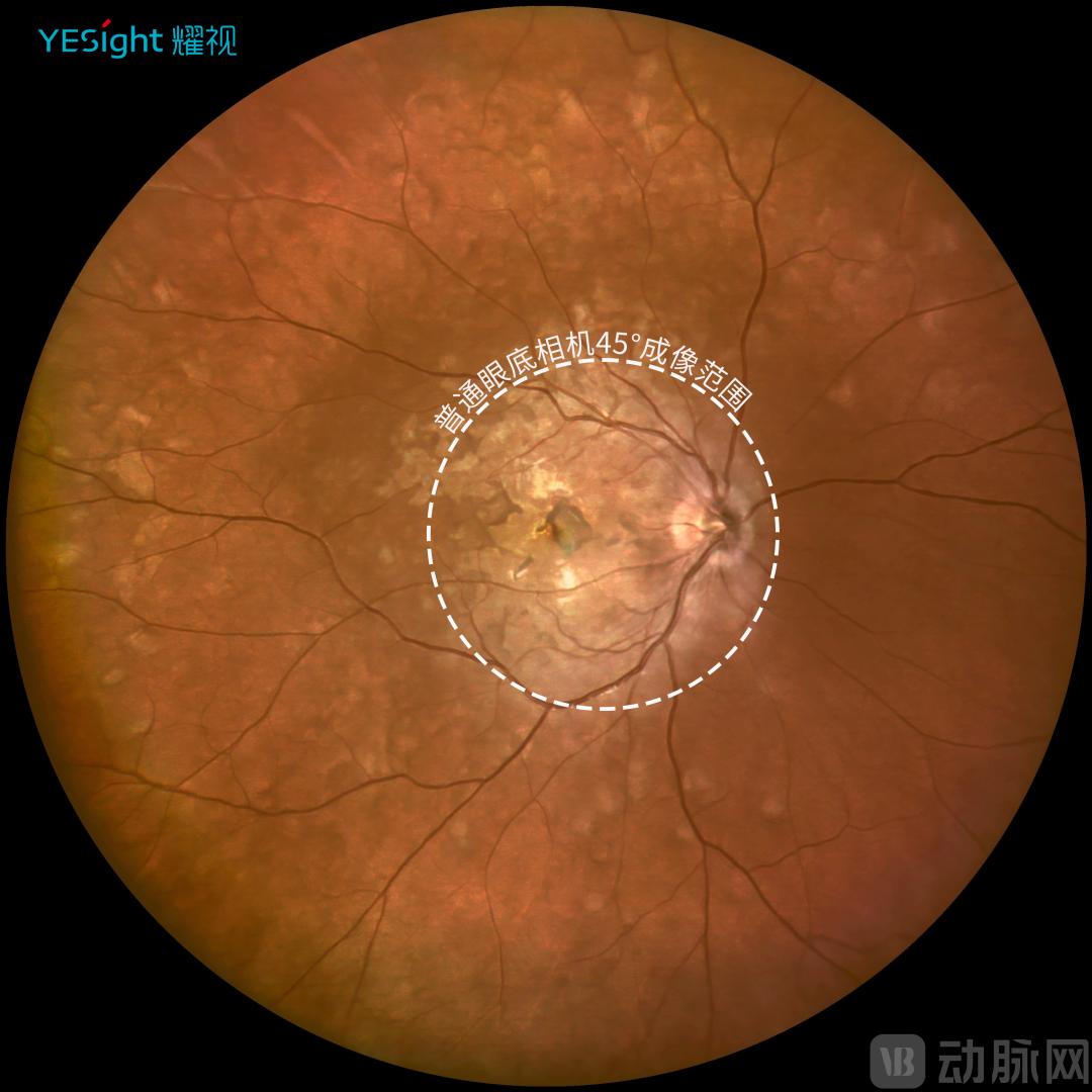 传统眼底彩照45°成像范围VS耀视168°成像范围