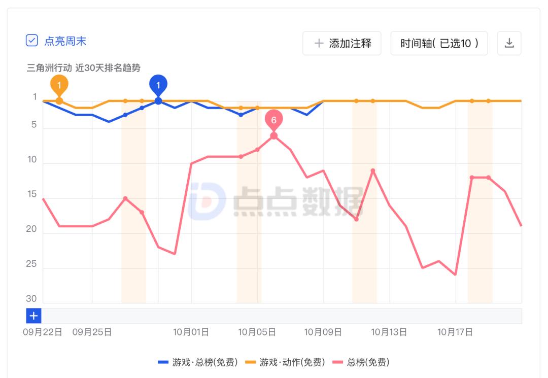 根据点点数据统计,10月上旬游戏iOS端收入出现明显回落,单日流水从约459万美元的高点降至最低点151万美元,跌幅一度超过六成。虽然其中可能有赛季末期玩家消费意愿降低的因素,但叠加同期免费榜排名的下跌,可以推测玩家付费热情受到了打击。