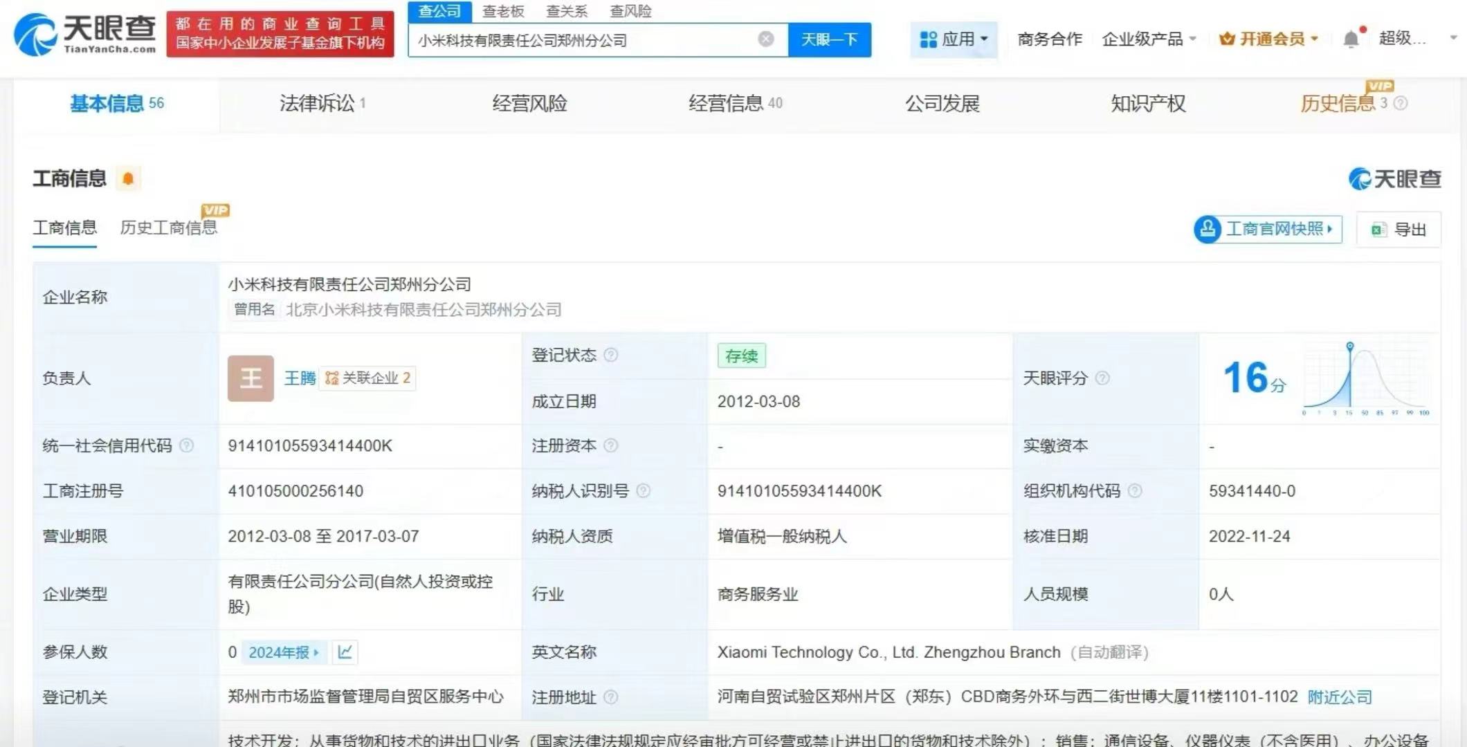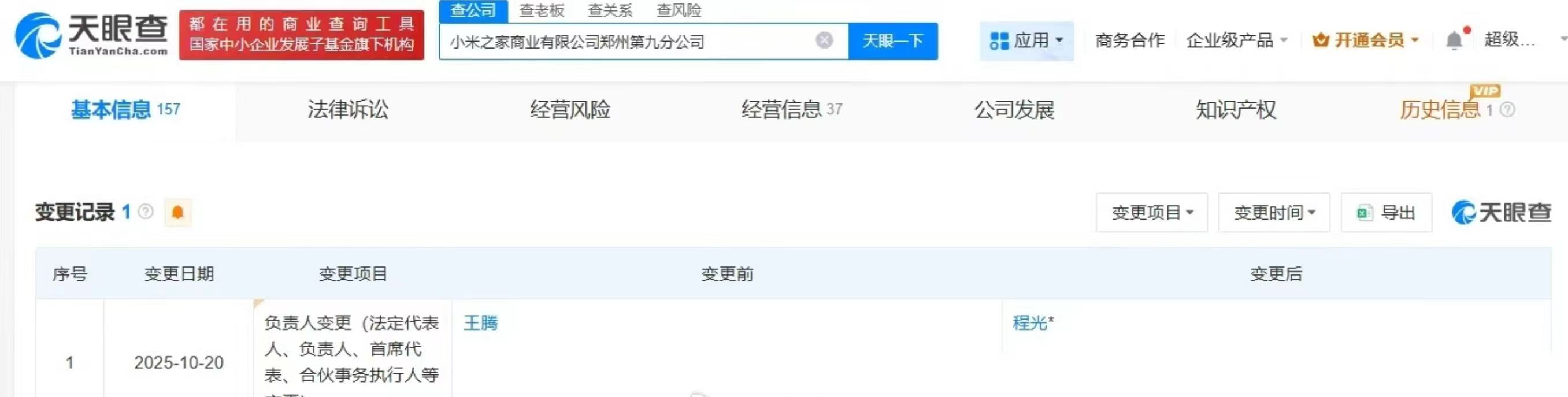 10月20日,天眼查APP显示,小米之家商业有限公司郑州第九分公司发生工商变更,王腾卸任该公司负责人,由程光接任,该公司成立于2022年11月。公开资料显示,程光是小米集团河南分公司总经理。