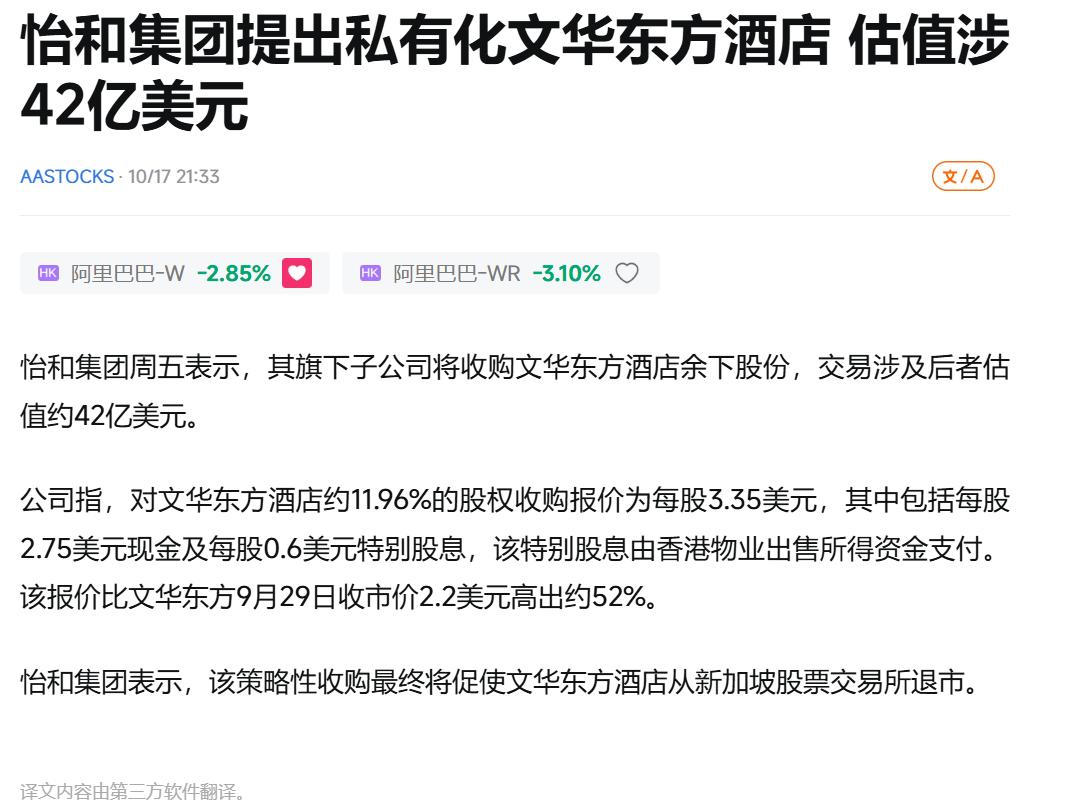 文华东方,就是那个住一晚能顶很多人一个月工资的奢牌酒店,被母公司怡和集团用42亿美元打包带走,从新加坡股市私有化退市了。