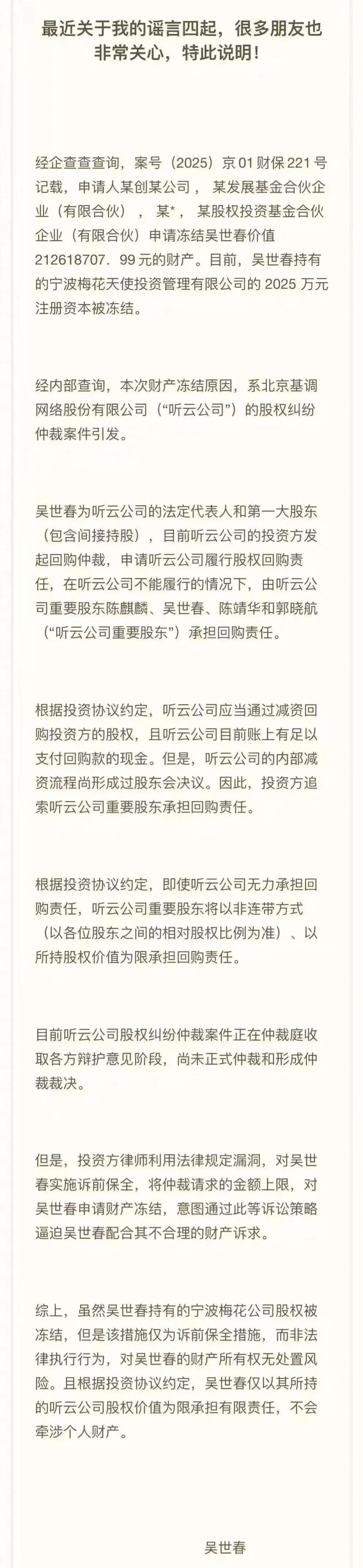 从吴世春的声明中得知,本次财产冻结,主要源于北京基调网络股份有限公司(简称“听云公司”)的股权纠纷仲裁案件。
