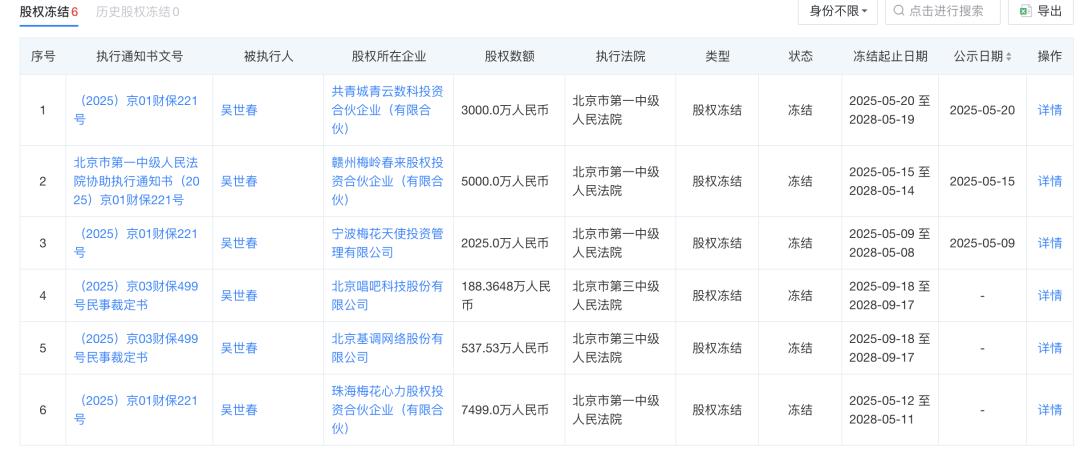 天眼查风险信息显示,2025年5月9日至20日期间,吴世春所持4家企业股权被陆续冻结,分别是共青城青云数科投资合伙企业(有限合伙)、赣州梅岭春来股权投资合伙企业(有限合伙)、宁波梅花天使投资管理有限公司、珠海梅花心力股权投资合伙企业(有限合伙),冻结数额分别是3000万元、5000万元、2025万元、7499万元,冻结期限均为三年。