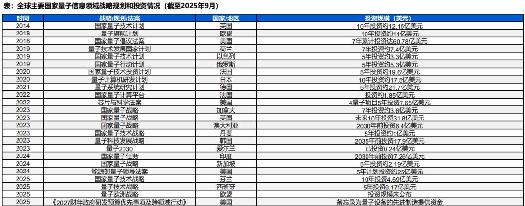 其中,美国于2025年9月23日白宫发布的2027财年政府研发优先事项备忘录中,明确将人工智能与量子计算列为2027年研发预算优先级首位,并指出量子计算正从实验室走向产业化应用的关键拐点已至,2027年是重要拐点。