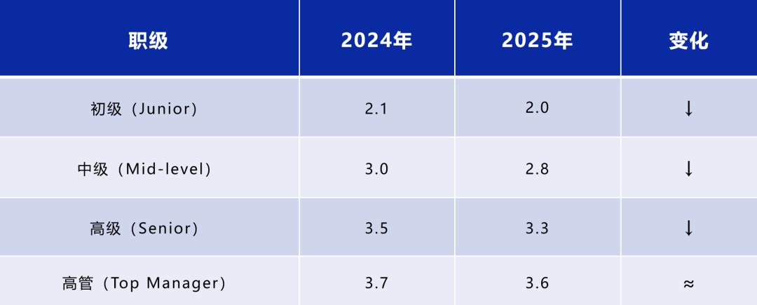调查让受访者在1到5分之间为自己对薪资的满意度打分。与2024年相比,2025年各层级的满意度整体下降: