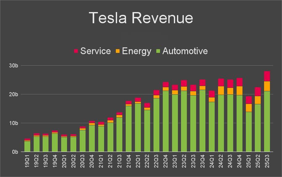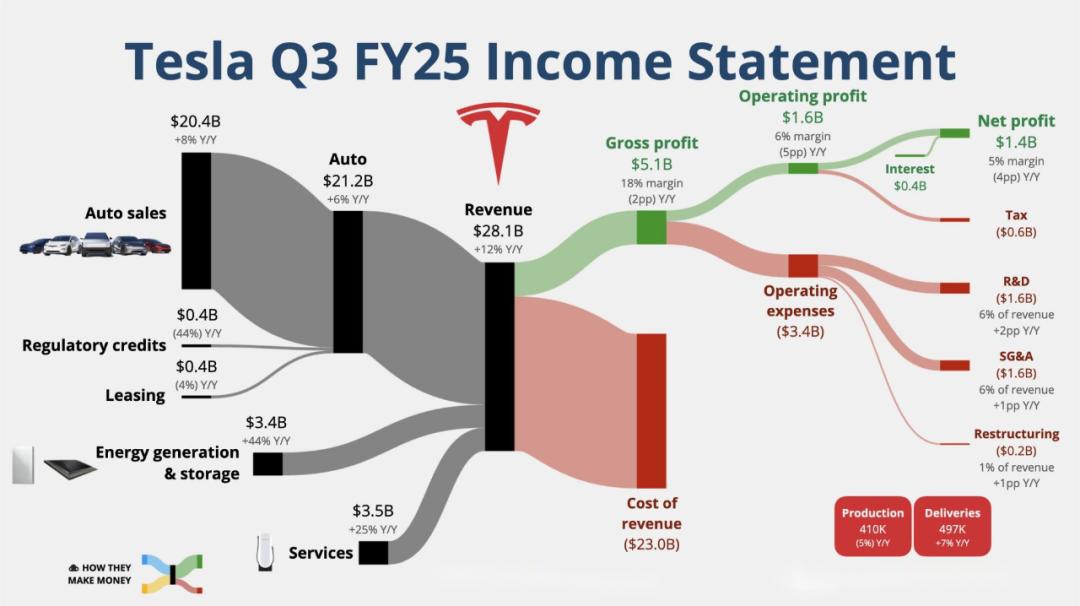 得益于美国消费者在电动车税收抵免政策到期前抢购,特斯拉本季度全球交付量创下49.7099万辆的单季最高纪录,带动汽车业务收入同比增长6%,创下近两年来单季新高。