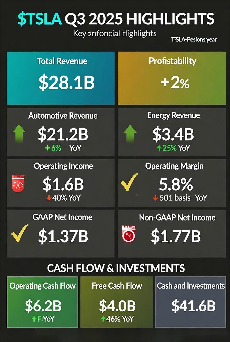 周三美股盘后,特斯拉公布了2025年第三季度财务业绩。这份财报描绘了这家电动车巨头“营收大反弹、但盈利承压加剧”的复杂图景。