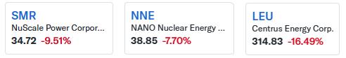 Oklo的估值危机迅速扩散至整个核能板块,导致SMR、NNE和LEU等其他核能概念股也普遍下跌。
