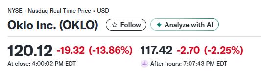 核电股的领跌者Oklo,其股价暴跌主要受以下三方面因素驱动: