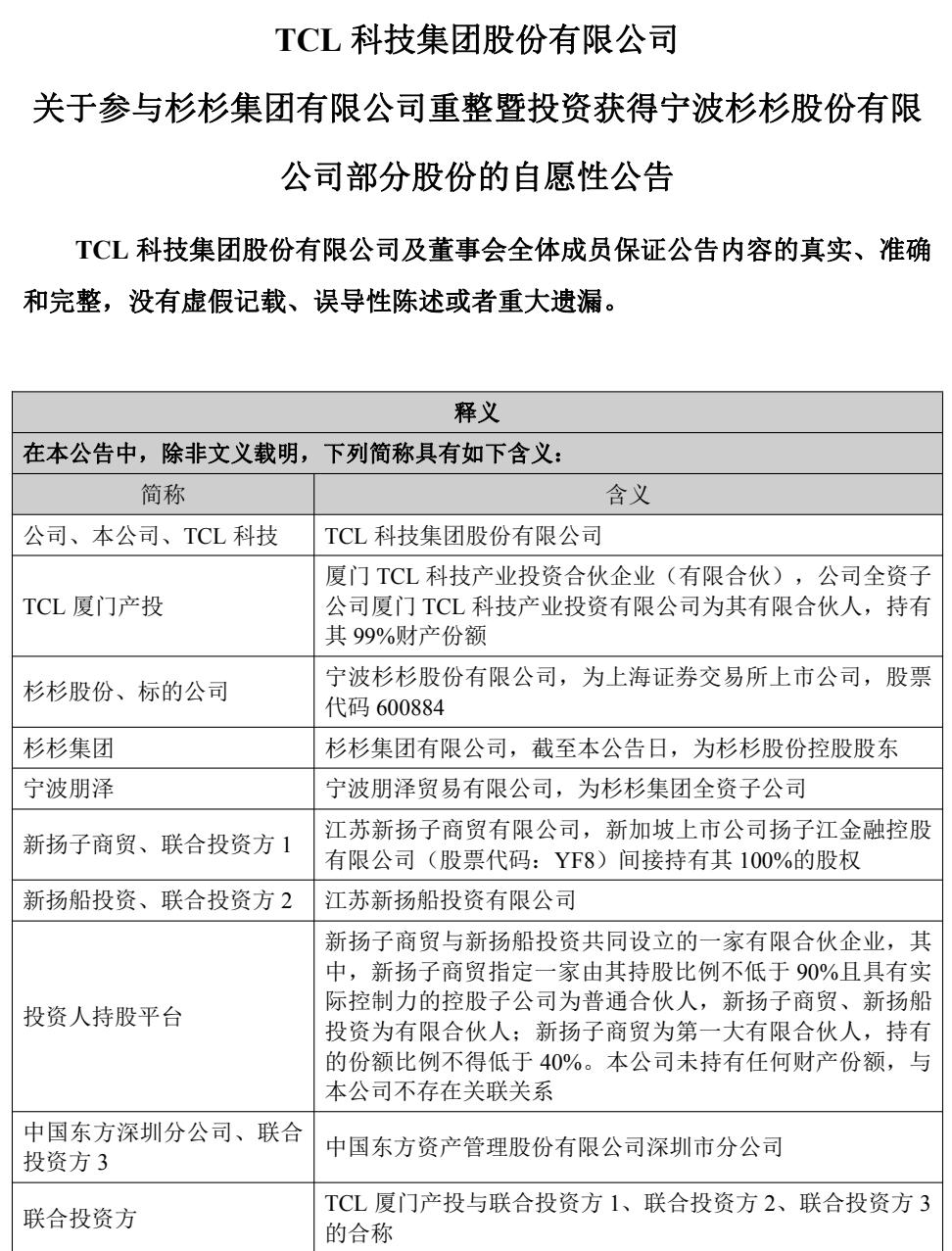按照计划,TCL厦门产投此次重整中的投资额不超过5亿元,预计重整后,TCL将获得杉杉集团及其全资子公司宁波朋泽持有的4370.09万股杉杉股份股票,持股比例约为1.94%,最终股份数量将由债权人会议结果及法院裁定而定。