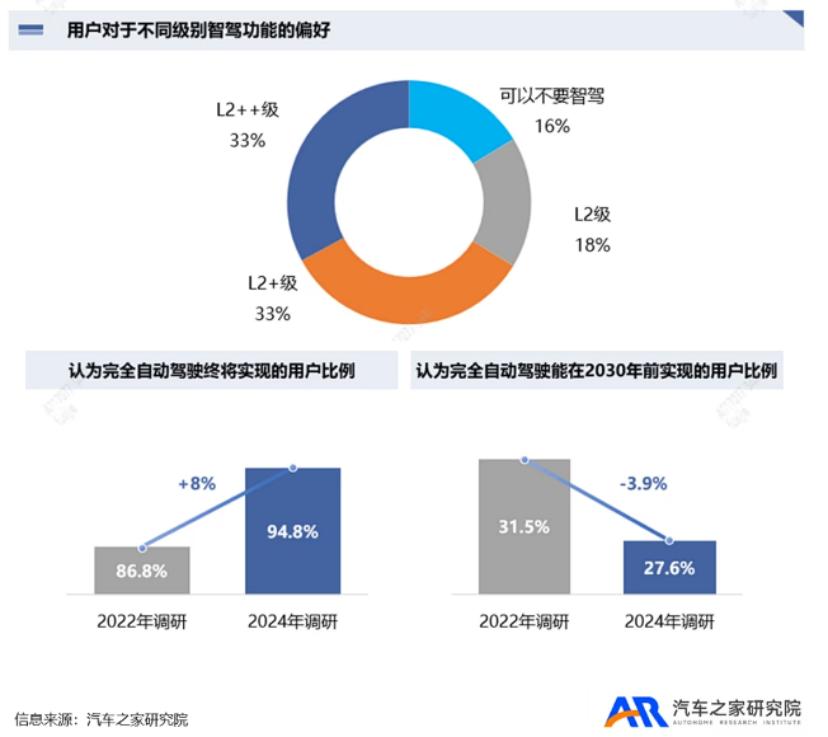 行业报告也印证了这一点。根据汽车之家研究院调查,仅有16%用户表示可以不要智能驾驶功能,而66%的用户已不满足于L2级别辅助驾驶。