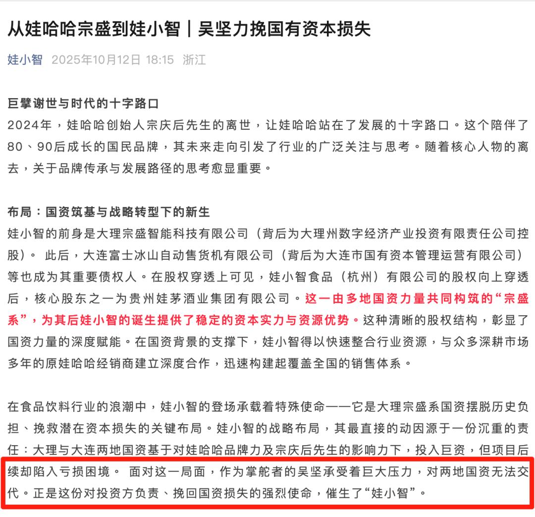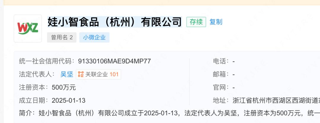企查查显示,娃小智食品(杭州)有限公司成立于2025年1月,注册资本500万元,宗泽后通过贵州娃茅酒业集团等控股33.211%。吴坚为公司法定代表人,同时也是宗盛系多家子公司的负责人。