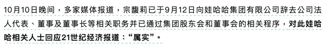 10月10日晚,多家媒体确认宗庆后之女、娃哈哈集团董事长宗馥莉,已于9月12日正式辞去集团法定代表人、董事及董事长职务。