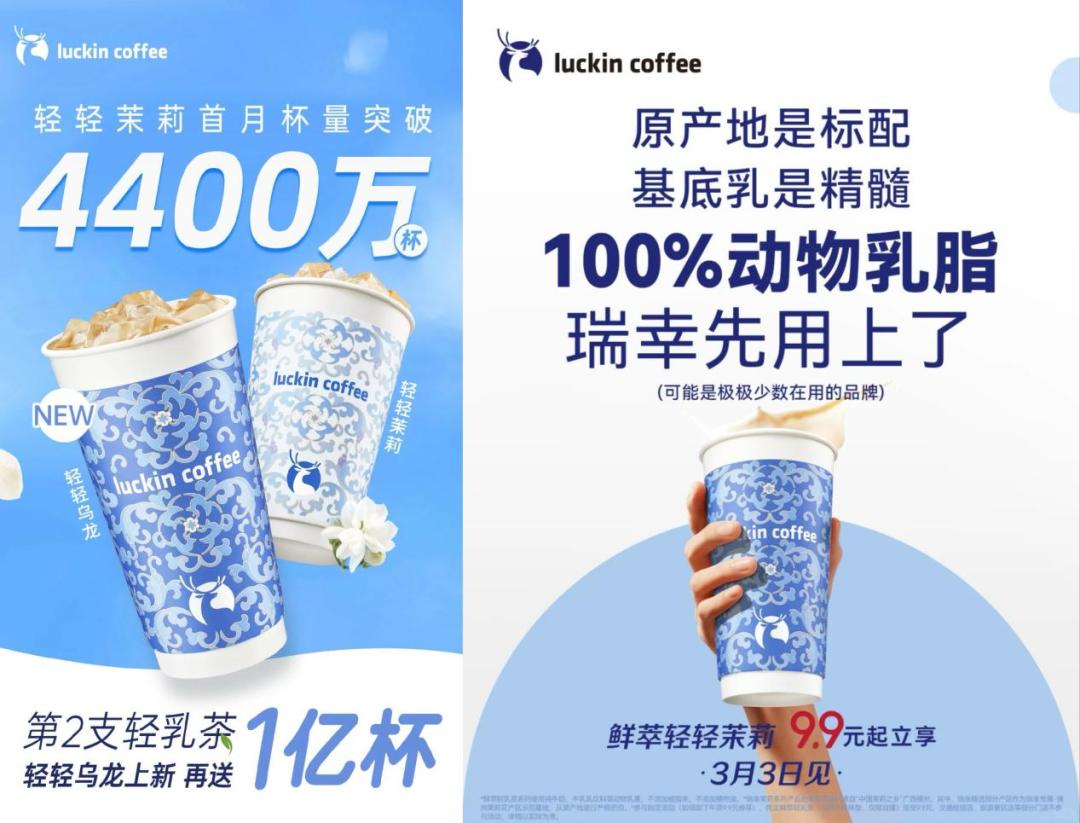 凭借成熟的门店网络和供应体系,咖啡渠道也开始公开“抢人”。去年,瑞幸高调官宣刘亦菲为茶饮首席推荐官,并推出名为“轻轻茉莉”的茶饮和霸王茶姬的拳头产品“伯牙绝弦”正面对垒。次日,瑞幸开启“送1亿杯9.9下午茶”的活动,而市面上与其配料相似的奶茶售价却普遍在二、三十元的价格区间。