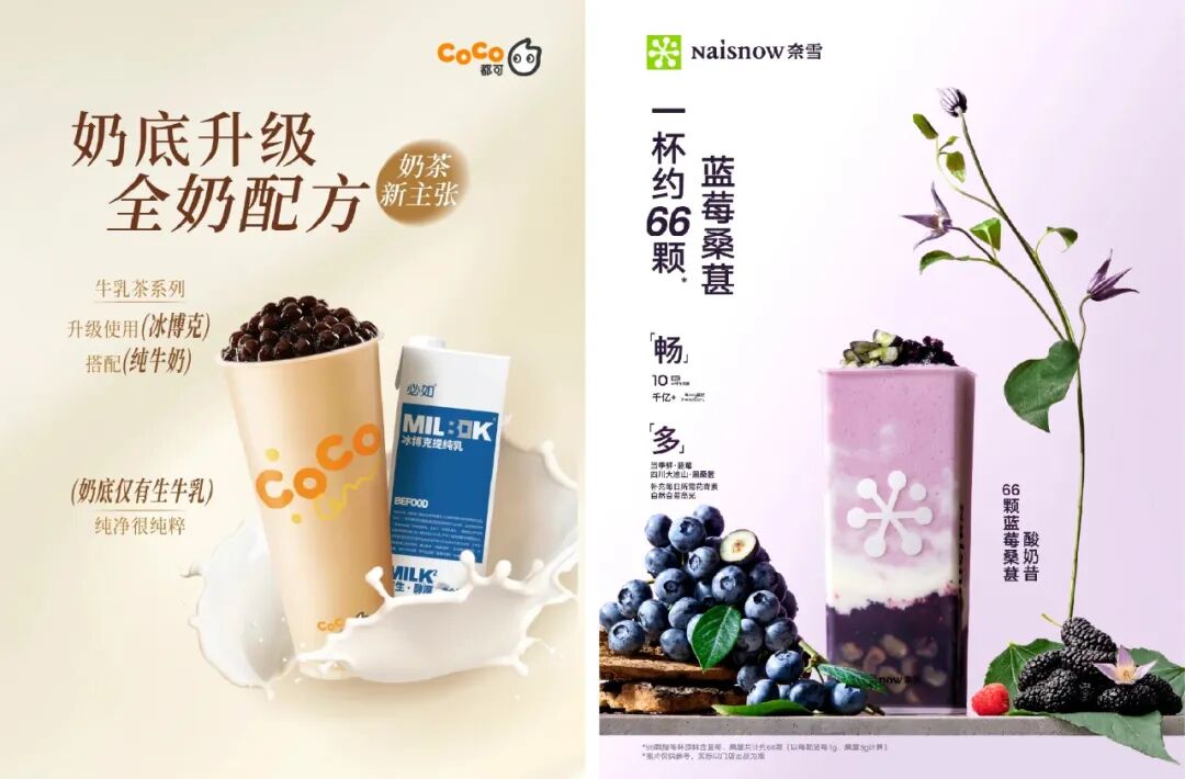 更为紧迫的是,瑞幸联合中国食品报社发布了《品质轻乳茶采用“三个100”标准》倡议,替茶饮们行驶对茶饮料的品类定义权——“茶:100%真茶鲜萃,乳:100%动物乳脂,轻:每杯(约450mL),热量100kcal左右”。价格上卷生卷死,理念上抢先一步,瑞幸的奶茶策略大大地动摇了茶饮们的核心客群。