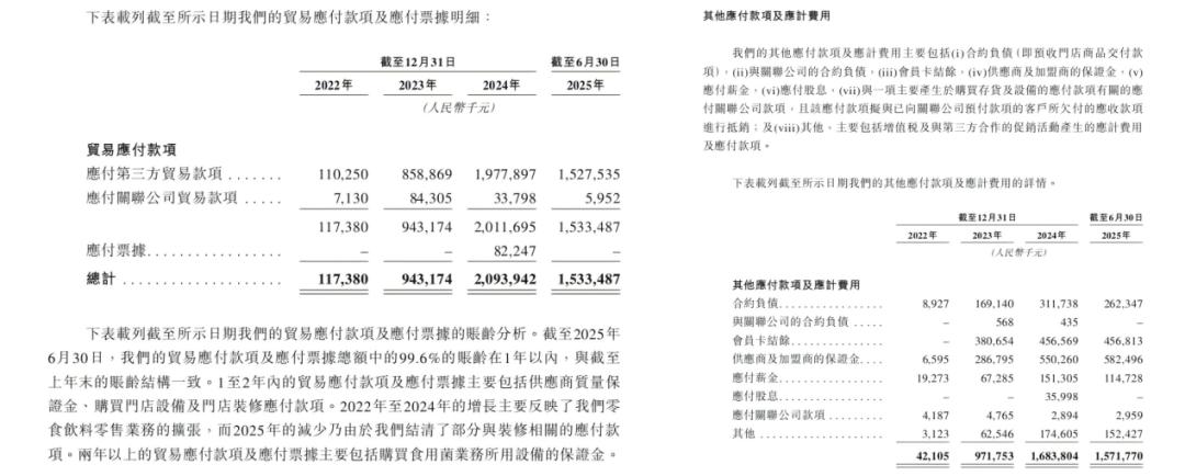 一般情况下,贸易商付款可被视作对供应商的应付、未付款项;其他应付款项则来自对加盟商的预收货款、会员卡结余及加盟保证金等。以此计算,万辰集团对供应商的“欠款”负债占总负债的29.9%;对下游加盟商的“押款”导致的负债则为30.7%。