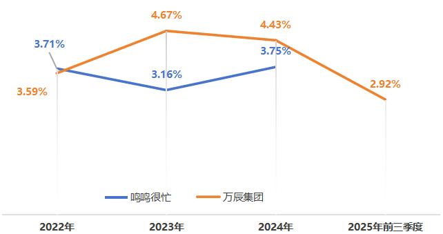 在上一年度,万辰集团的销售费用提升至14.31亿元,主要源于门店扩张导致的市场推广费用、销售人员薪酬增加。参考当年323.29亿元的营收,万辰集团的销售费用率微跌至4.43%。时至2025年前三季度,这一数字又进一步降至2.92%。