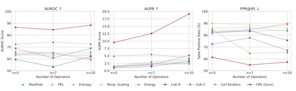 CRV与多种验证方法的性能对比。图中展示了不同方法在算术推理任务下的检测表现。