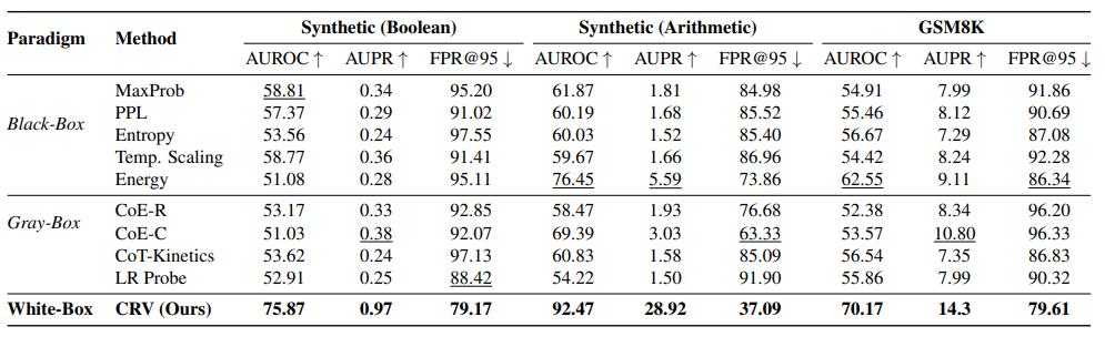 在算术推理实验中,CRV 的检测精度(AUROC)从76.45提升至92.47,误报率从63.33%降至37.09%。