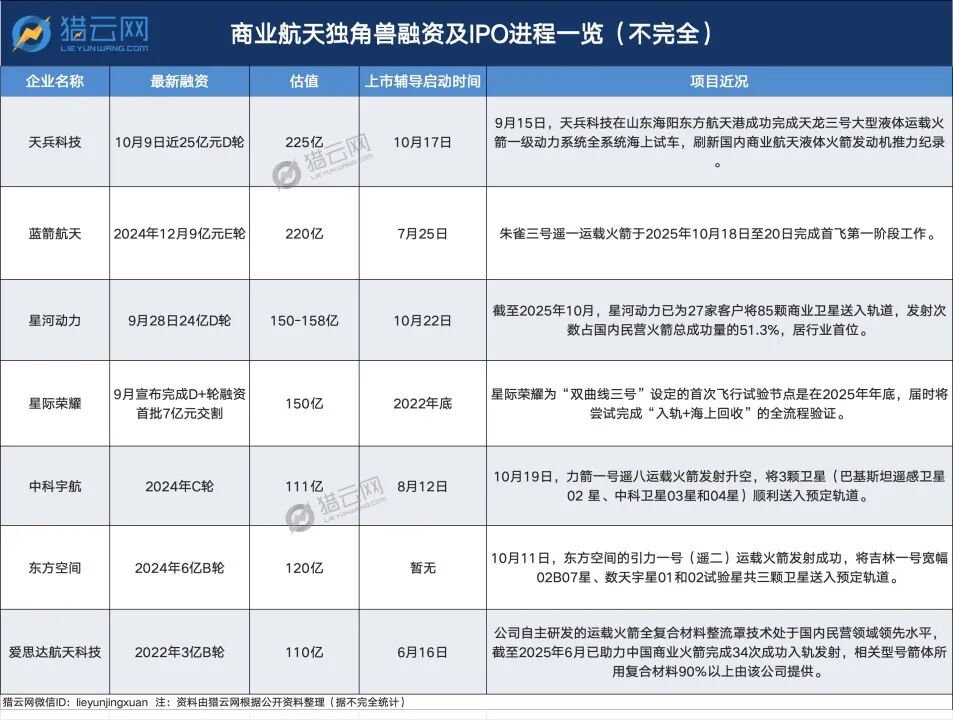 这其中,天兵科技与星河动力分别于10月17日和10月22日启动上市辅导,距离最新一轮融资均不超过1个月时间。