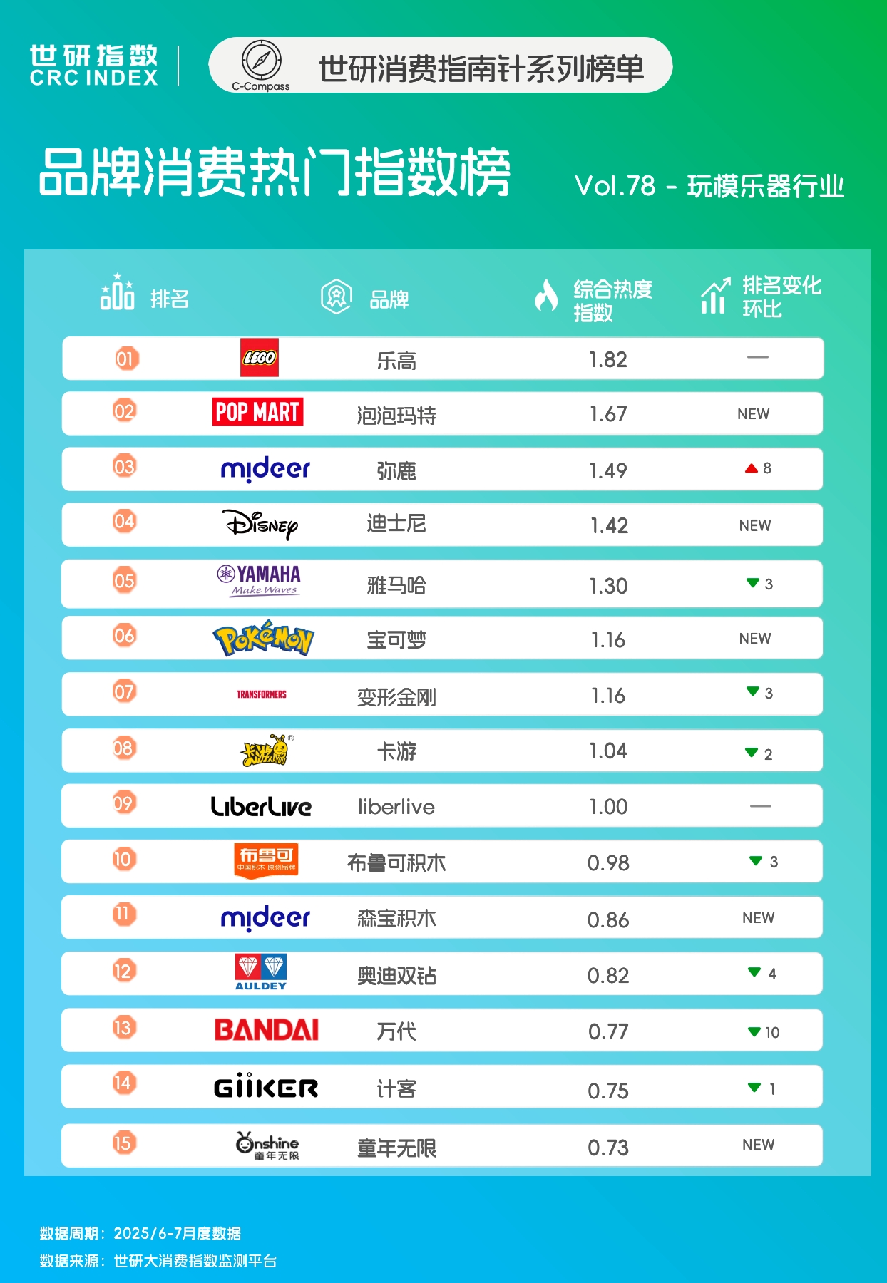 从本月上榜品牌分布来看,乐高、迪士尼与卡游虽分处产业不同环节,却共同揭示了玩模行业的核心趋势:以IP为价值内核,通过生态化运营满足用户情感与文化需求。