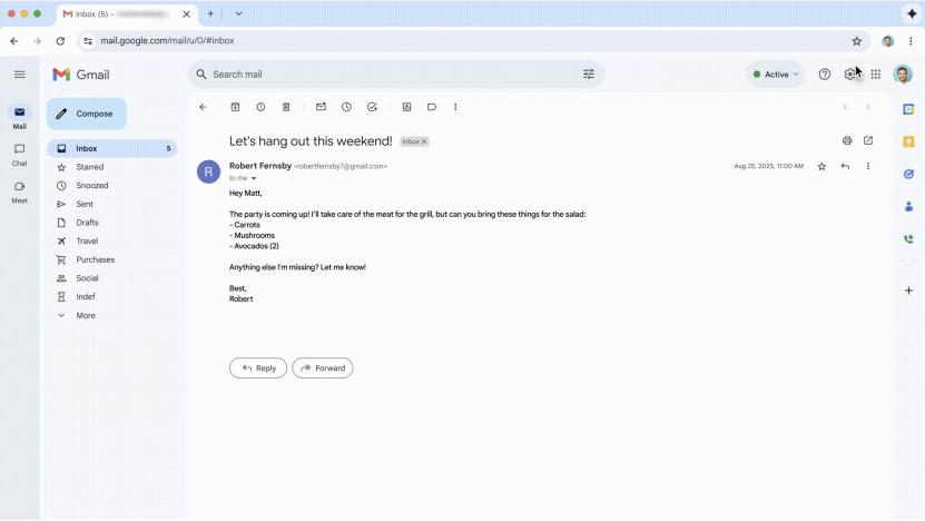 Chrome在一个多月前也更新了同类功能,示例是用户在侧边栏输入一句之后,AI智能体读了电邮中的菜谱,按菜谱自动在网店里点齐菜品放进网络购物车。除了最初的一句指令和最后的确认支付,用户本人完全不用插手AI智能体的工作流程。