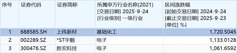 “924”行情一周年,人们盘点发现:A股有1435只股票实现翻番,并诞生了上纬新材(1720.5%)、*ST宇顺(1133.01%)、胜宏科技(1061.66%)三只10倍牛股。