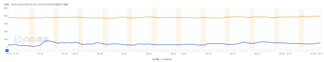 ChatPods 和来福近 90 天的双端下载量|图片来源:点点数据