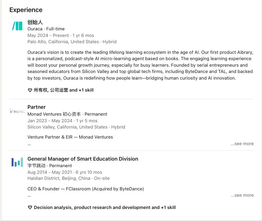 Aibrary 创始人李可佳早年曾开发过面向学校和教育机构的 K12 教育协作平台「极课大数据」,后被字节收购,他也加入字节担任智慧教育业务 CEO,2022 年离职后,他在初心资本短暂担任合伙人,2025 年 1 月,才在硅谷创立了 Ouraca。而另外两位联合创始人也深耕教育行业,其中包括前好未来国际投资与战略发展总监吴俊东,以及字节原教育中台负责人张栖铭。