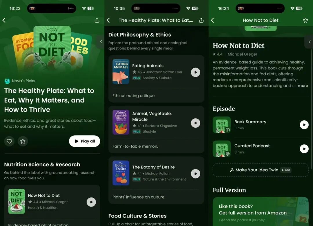 在听完两段音频后,用户就会对书籍有一个初步了解。如果感兴趣,用户可以选择点击下方的购买链接跳转到亚马逊购买纸质书籍,或点击“Make idea Twin Podcast”用 AI 生成另一个更符合自己兴趣点、更加个性化的播客,深入了解书籍内容。