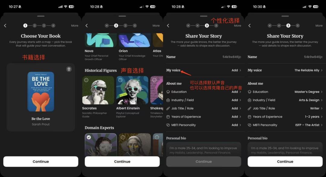 书籍选择(图 1),主持人声音选择(图 2),用户信息与声音克隆(图 3、4)