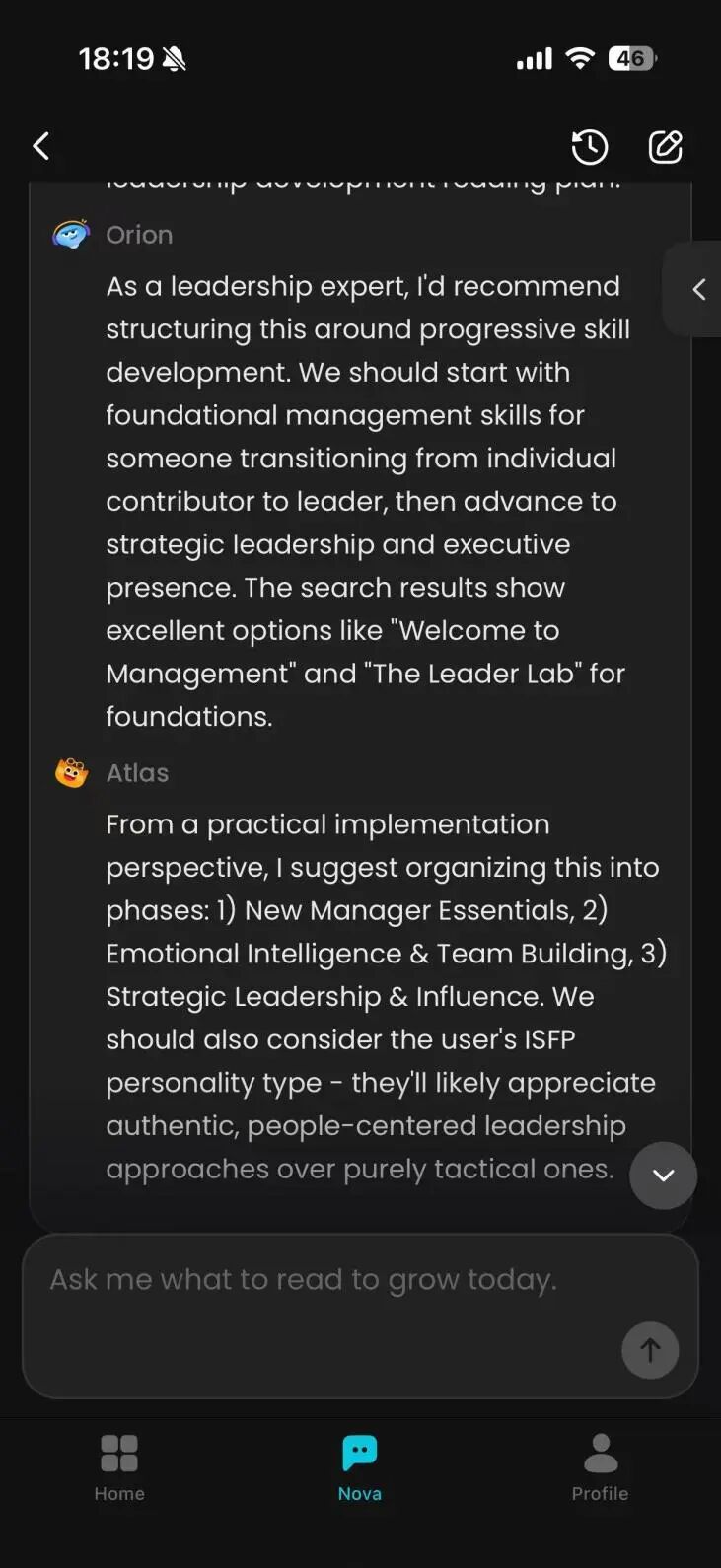 除了上述包含推荐与搜索的主页,Aibrary 的一级标签还有 Chatbot“Nova”,以及个人资料。在“Nova”中,用户可以与 ChatBot 对话(如图 4),提出更个性化的要求。Aibrary 的 ChatBot 拥有三个分工不同的角色,分别是主要与用户交互的 Nova、提供知识管理(询问与书籍相关的内容,搭建知识图谱等)服务的 Orion,以及主要负责拆解目标、帮用户复盘的 Atlas。