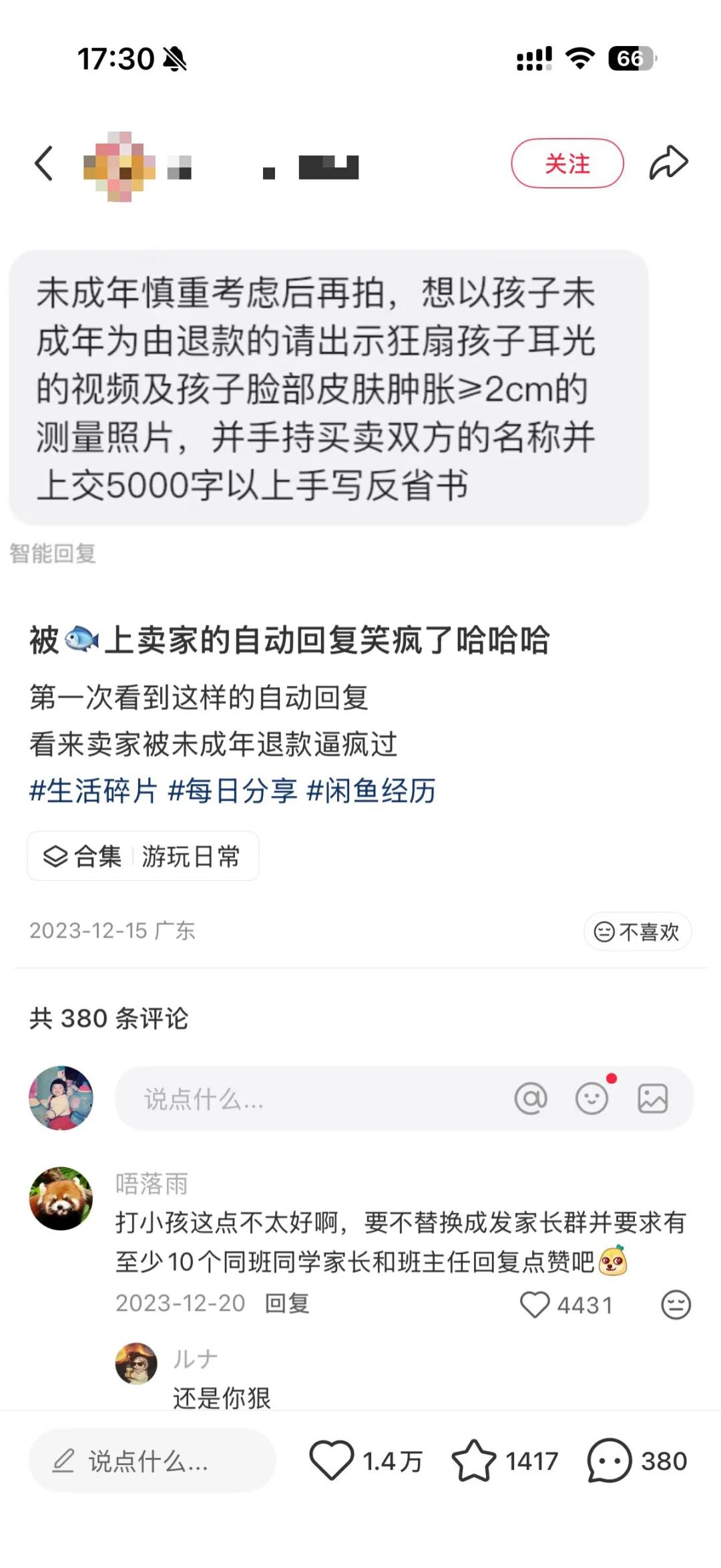 商家跟她说,这种情况的话,“需要提供家长怒骂孩子的视频3分钟”,还要“孩子手写的1000字检讨”,最关键的,还要“家长狂扇孩子5分钟耳光的视频”,并且要与孩子一起出现在画面中道歉。