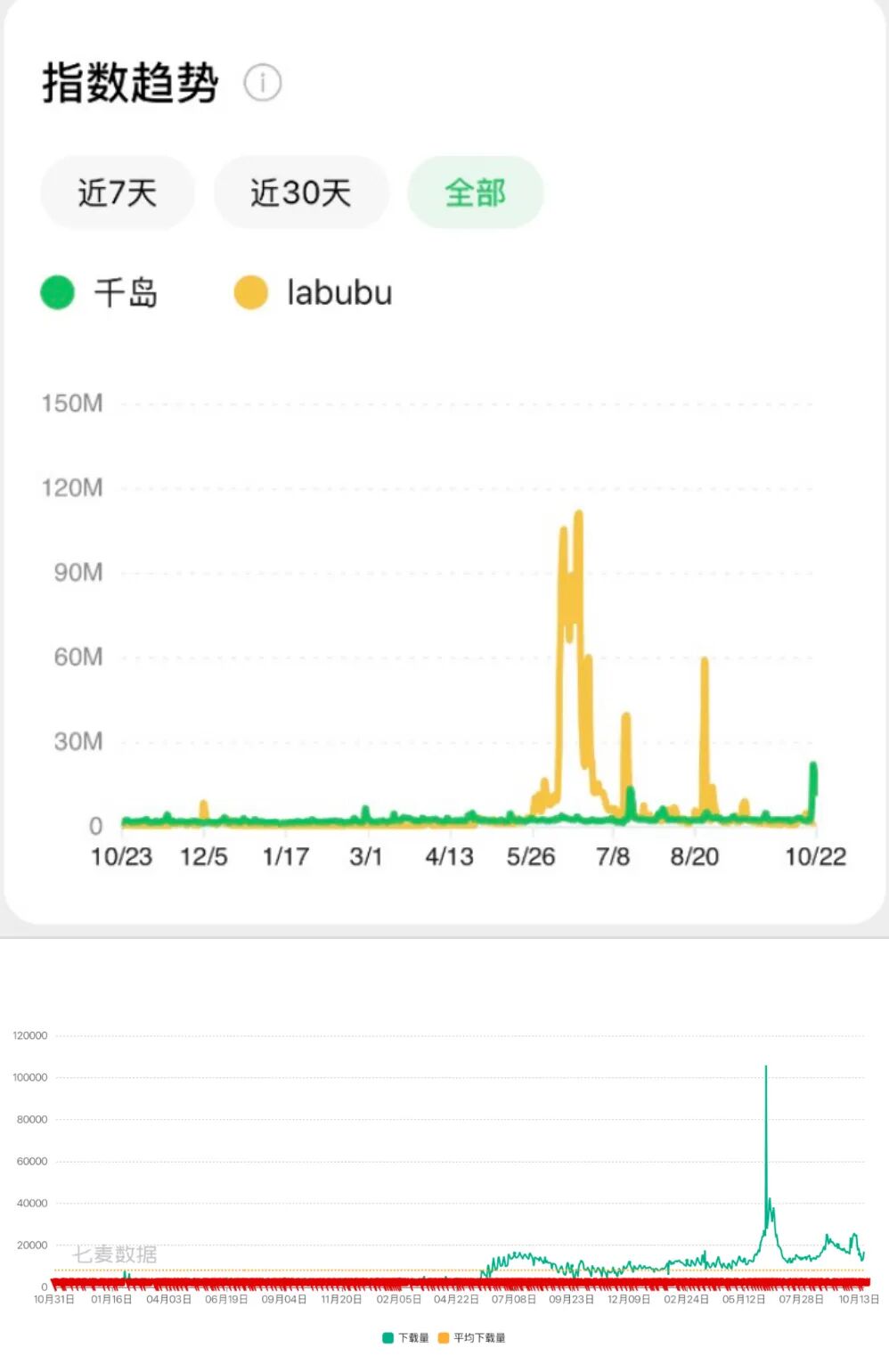 对比这两张图会发现,千岛的下载量大概在6月达到半年内的峰值,而labubu在微信指数上热度最高的时候,也在这个时间段。