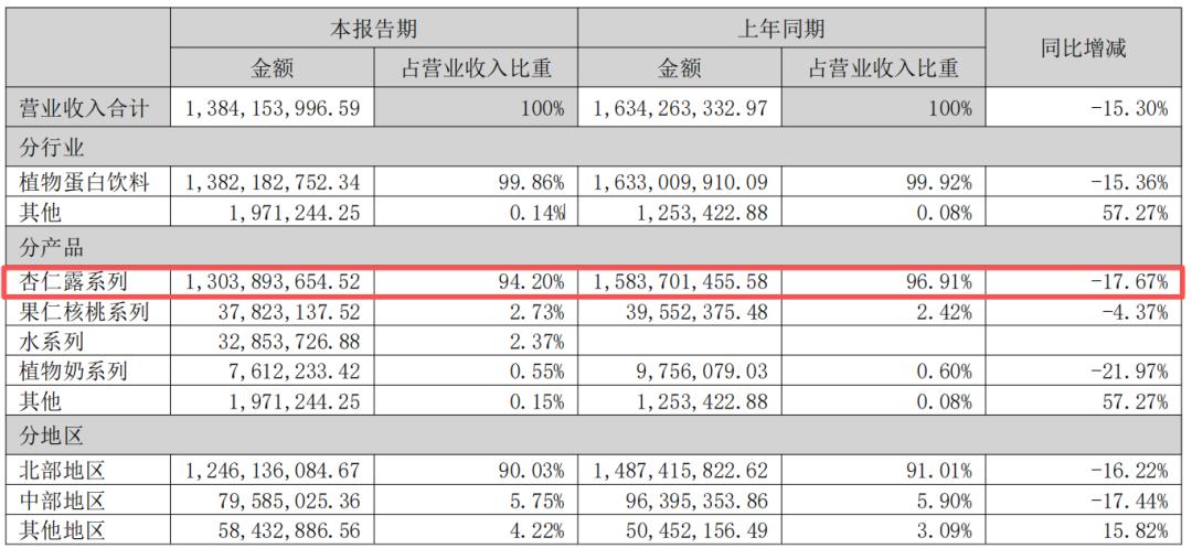 虽然,在杏仁露之外,公司也陆续开发出了果仁核桃露、杏仁奶等产品,但杏仁露对整体营收的贡献始终超过90%,且九成以上收入来自北方区域,没有向全国市场铺开。