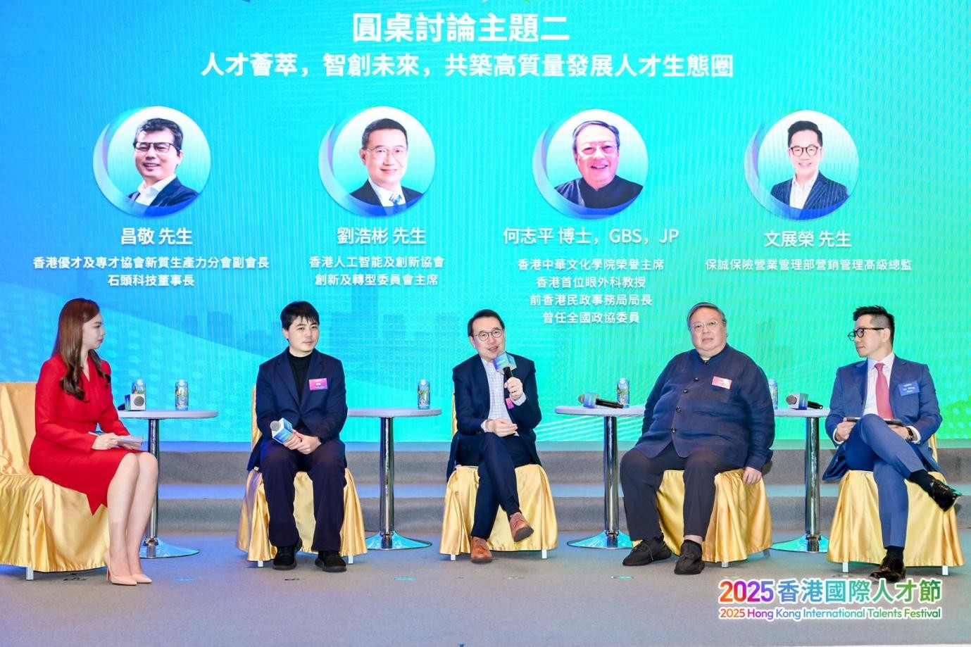 圆桌研讨环节,四位嘉宾包括香港优才及专才协会新质生产力分会副会长、石头科技董事长昌敬,香港人工智能及创新协会-创新及转型委员会主席刘浩彬,香港中华文化学院荣誉主席、香港首位眼外科教授、前香港民政事务局局长、曾任全国政协委员何志平博士,保诚保险营业管理部营销管理高级总监文展荣先生展开对话,提出香港应可依托国际化优势基础,聚焦医疗、科技等重点领域,结合AI创新与多元人才培育,打造兼顾当前需求与长远布局的高质量人才生态圈,助力城市持续创新与发展。