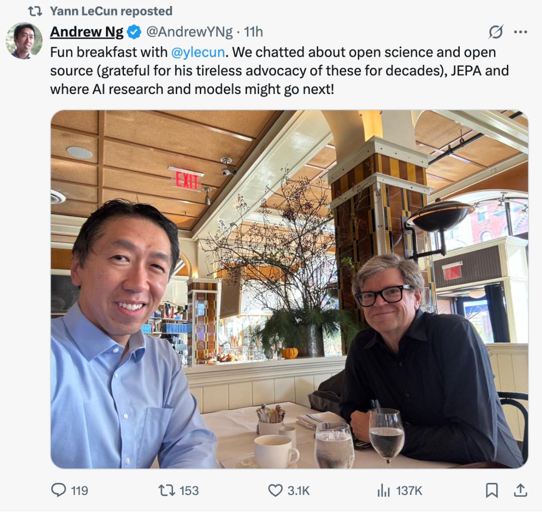 此外,在 Meta 内部动荡之际,LeCun 正与好友 Andrew Ng 吃饭、聊天。