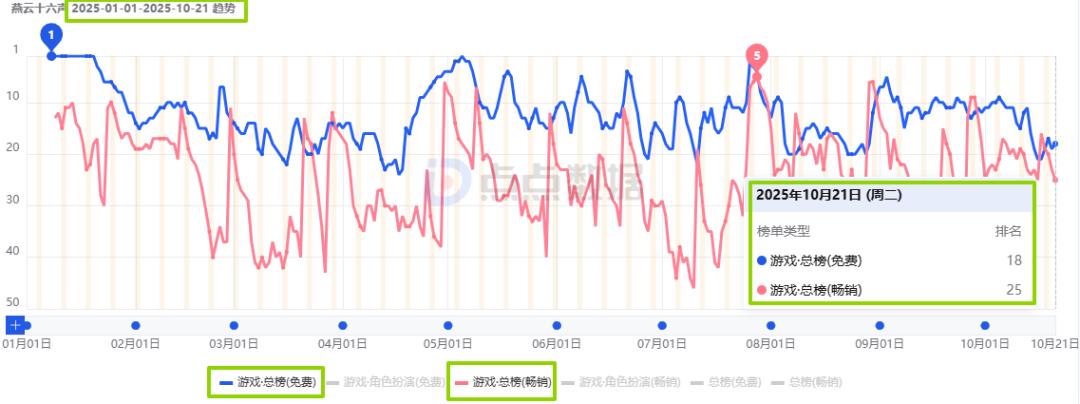 在国庆档(10月1日至8日)同样的TOP25榜单中,网易上榜的产品基本没有变,按先后顺序分别为《梦幻西游》、《燕云十六声》、《逆水寒》以及《蛋仔派对》。