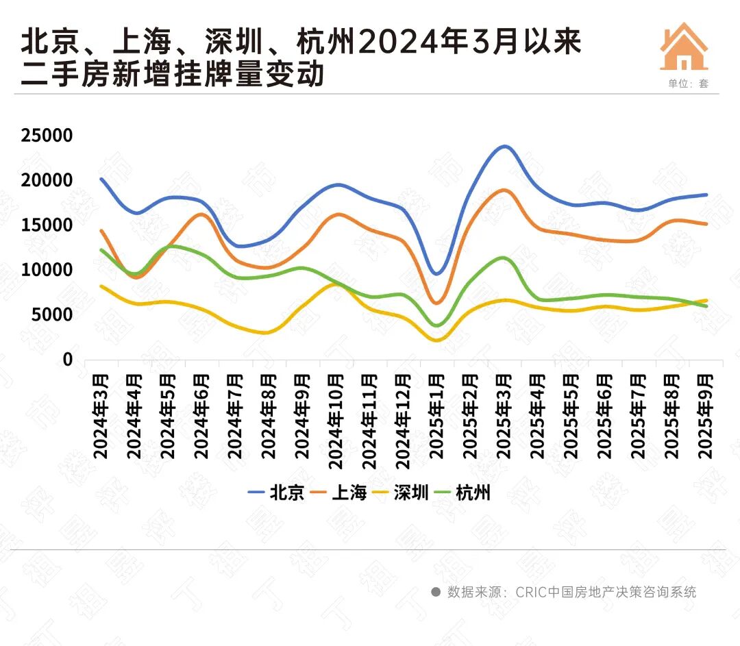 根据CRIC数据,9月北京、上海、深圳和杭州4城共有4.6万套二手房新增挂牌,挂牌量与8月基本持平。