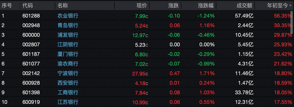 银行板块年初至今股价涨幅榜前十,图片来源Wind