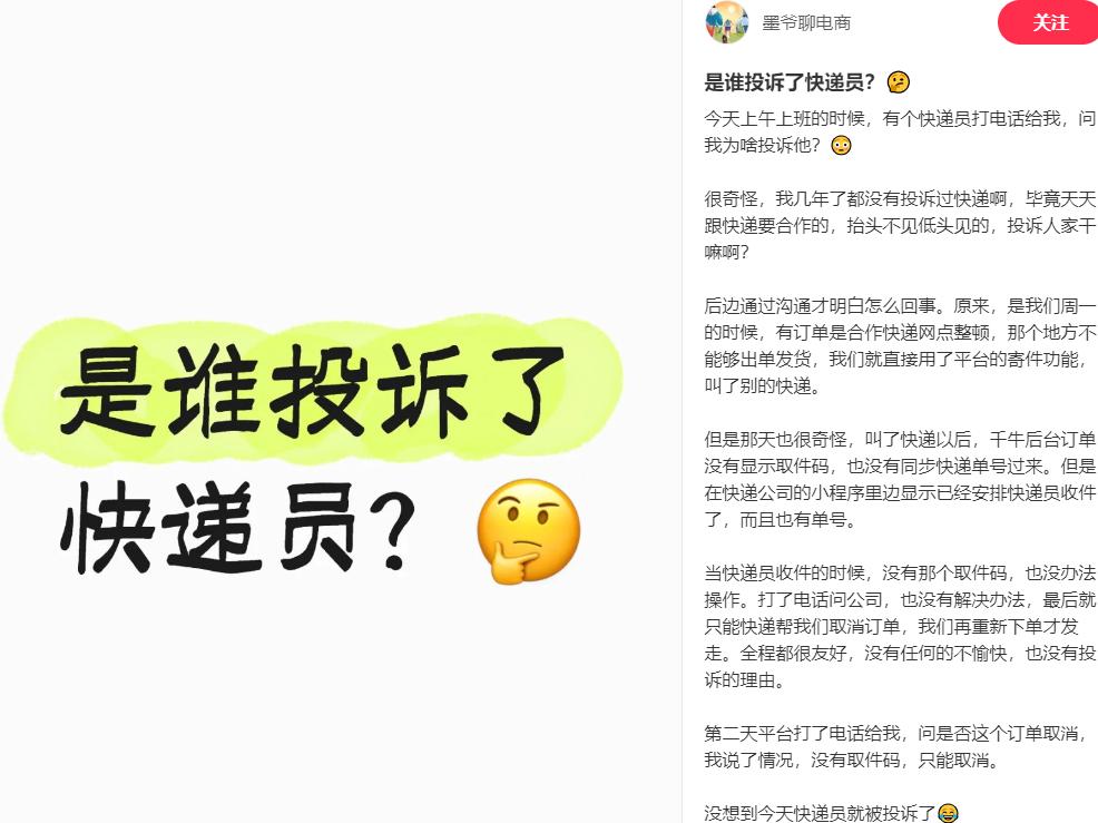 网友“墨爷聊电商”的经历同样让人费解:在发快递时,因千牛后台此订单没有显示取件码,也没有同步快递单号,但是快递公司的小程序显示已安排快递小哥取件,并且显示了快递单号,但因为没有取件码,无法操作,打电话和公司沟通也没有解决,于是取消订单,重新下单发货,全程友好的解决了问题。谁知,取消订单的操作便成了一条投诉。