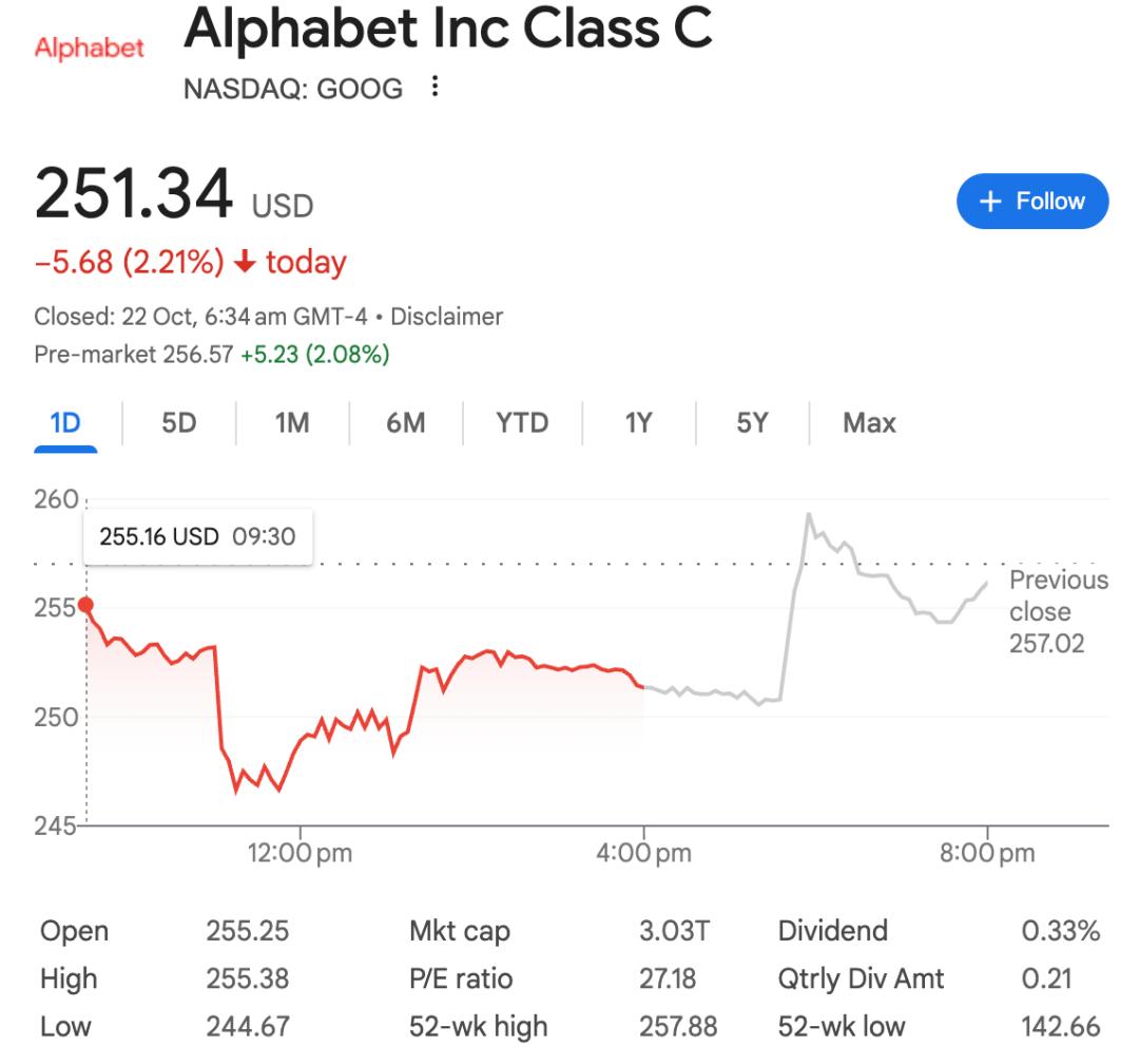 警报声中,谷歌的股价应声下跌4.8%。