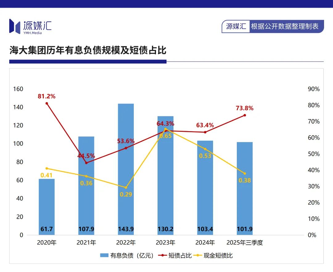 但有息负债部分却呈现快速上涨,上述同期,从61.7亿元升至130.2亿元,回落到2025年三季度的101.9亿元。更重要的是,公司经营资金流动压力短暂缓解之后,又开始走下坡路,现金短债比从2023年的0.65倍跌到2025年三季度的0.38倍。