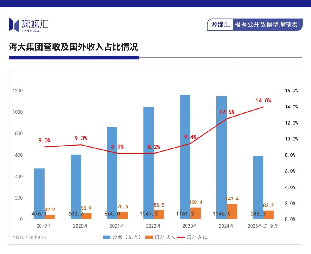 海大集团的海外业务进入高速发展期,特别是在2021年之后。集团海外业务收入从2019年的43亿元上涨至2024年的143.4亿元,年复合增长率达27.3%,2025年三季度进一步同比增长10.87%至82.2亿元。